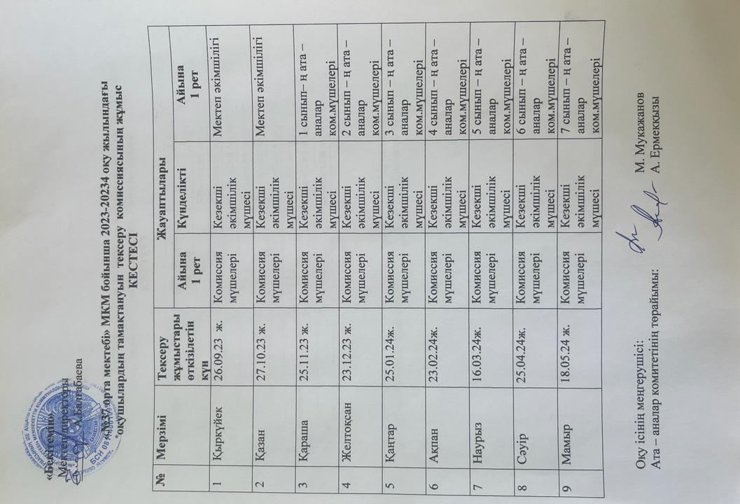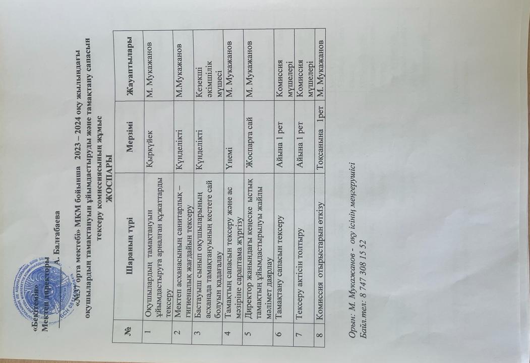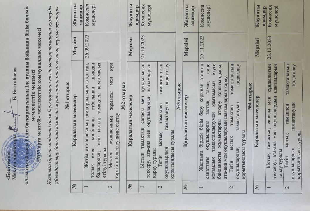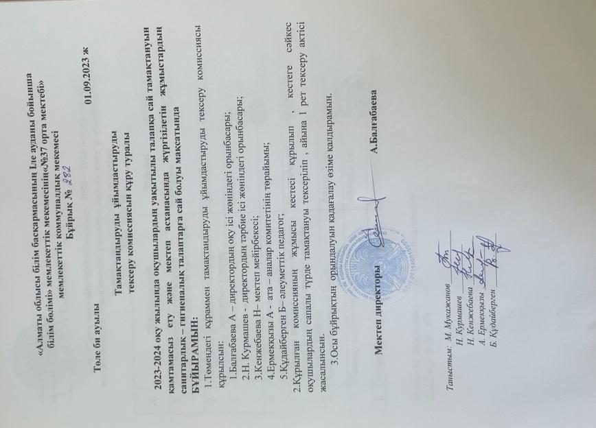 01 сентябрь 2023 0 1 2 3 4 5 Ыстық тамақ "№37 орта мектебі" МКМ бойынша Тамақтандаруды ұйымдастыруды тексеру комиссиясының жұмыстары туралы бұйрық, жоспарлары